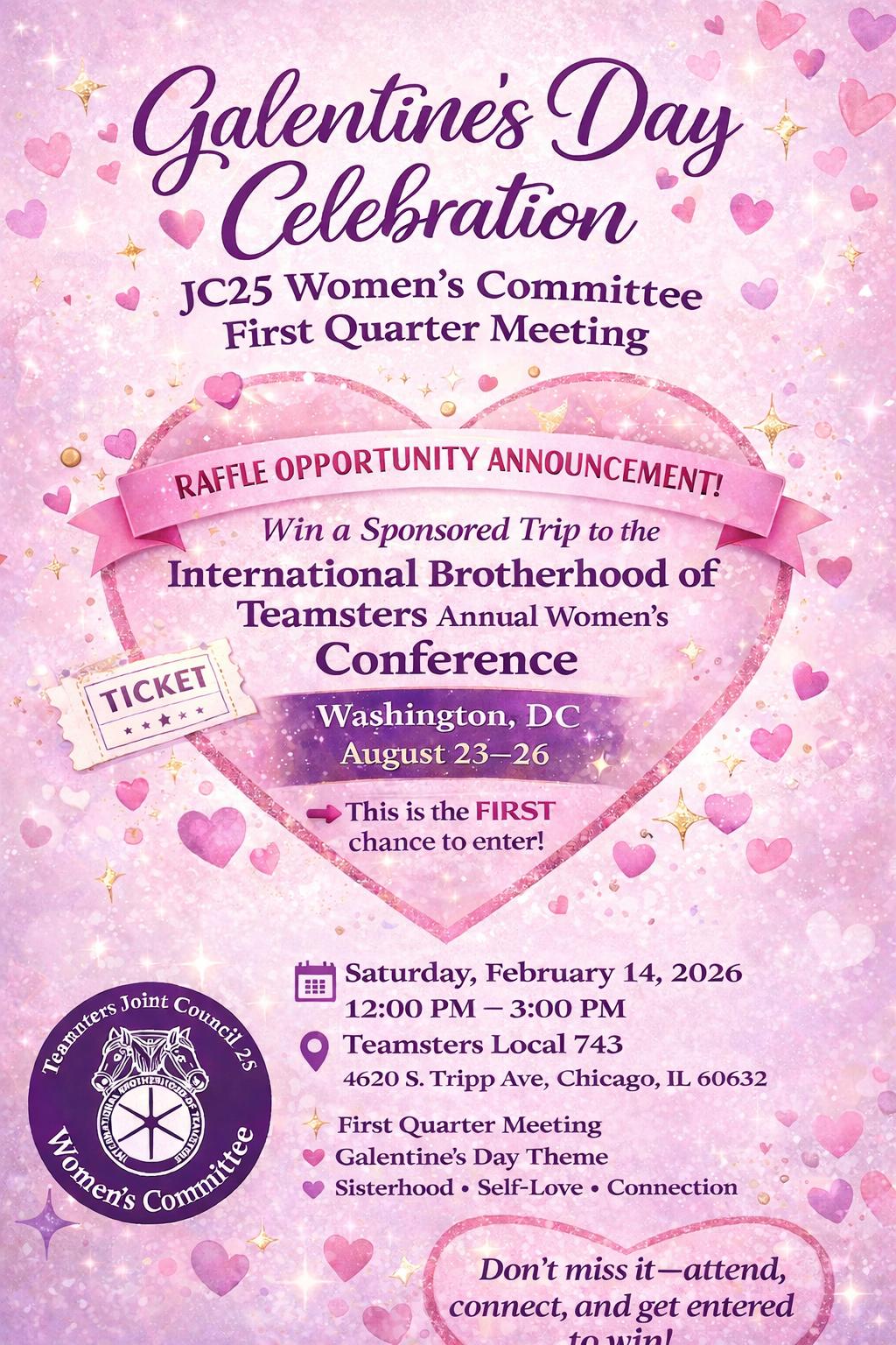 First Quarter Meeting & Galentine’s Day Celebration The JC25 Women’s Committee is excited to invite our members to our First Quarter Meeting, celebrating Galentine’s Day — a day dedicated to sisterhood, self-love, and connection. Saturday, February 14, 2026 12:00 PM – 3:00 PM Teamsters Local 743 4620 S.